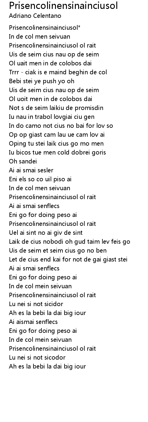 "Full English translation of Prisencolinensinainciusol #AdrianoCelentano", When Adriano Celentano wrote this song, he intended it to sound to its Italian audience, as if it is sung in English, spoken with an . "Adriano Celentano - Prisencolinensinainciusol (LIVE 2012)", Special for https://vk.com/club63184505...